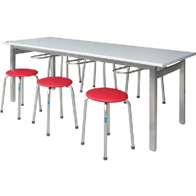 Bàn dành cho khu công nghiệp. Phần khung làm bằng Inox hoặc khung sơn tĩnh điện. Chân trụ ống vuông 40 x 40 mm, gồm 6 chỗ ngồi, có thanh treo ghế riêng biệt. Mặt bàn gỗ phủ lamilate. giá chưa bao gồm ghế |
